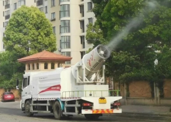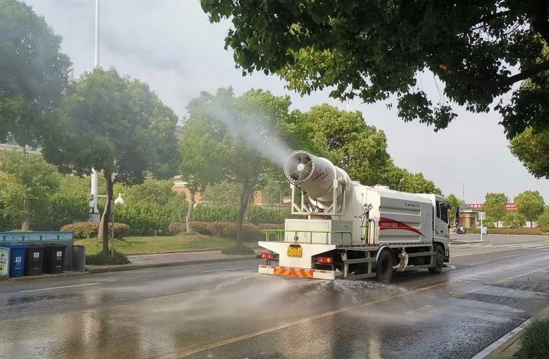 抑塵霧炮車采用水霧除塵的方式,將水經過壓力霧化成水霧,通過裝于車后部平臺的噴霧炮,在風機作用下,將霧化成細微的水霧顆粒噴射到空氣中,使塵粒變濕潤,在重力作用下下沉。夏季高溫天氣,通過噴射水霧顆粒可以快速給路面降溫;冬季霧霾天氣,可以液霧降塵、分解淡化空氣中的顆粒濃度等。