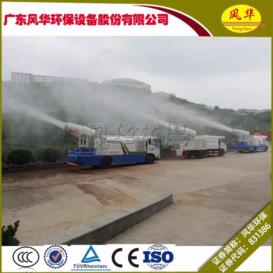 這種霧炮車,正是來自于我們風(fēng)華環(huán)保跟車廠合作研制的多功能抑塵車,集灑水、除塵、降溫、防疫消毒等功能于一身。結(jié)構(gòu)是一輛大型灑水車,上面安裝大口徑霧炮噴霧機(jī),具有灑水車和噴霧車的多重功能。一次能裝8噸自來水,炮筒可以200度隨意旋轉(zhuǎn),噴出的水霧可以起到除塵降溫的作用。